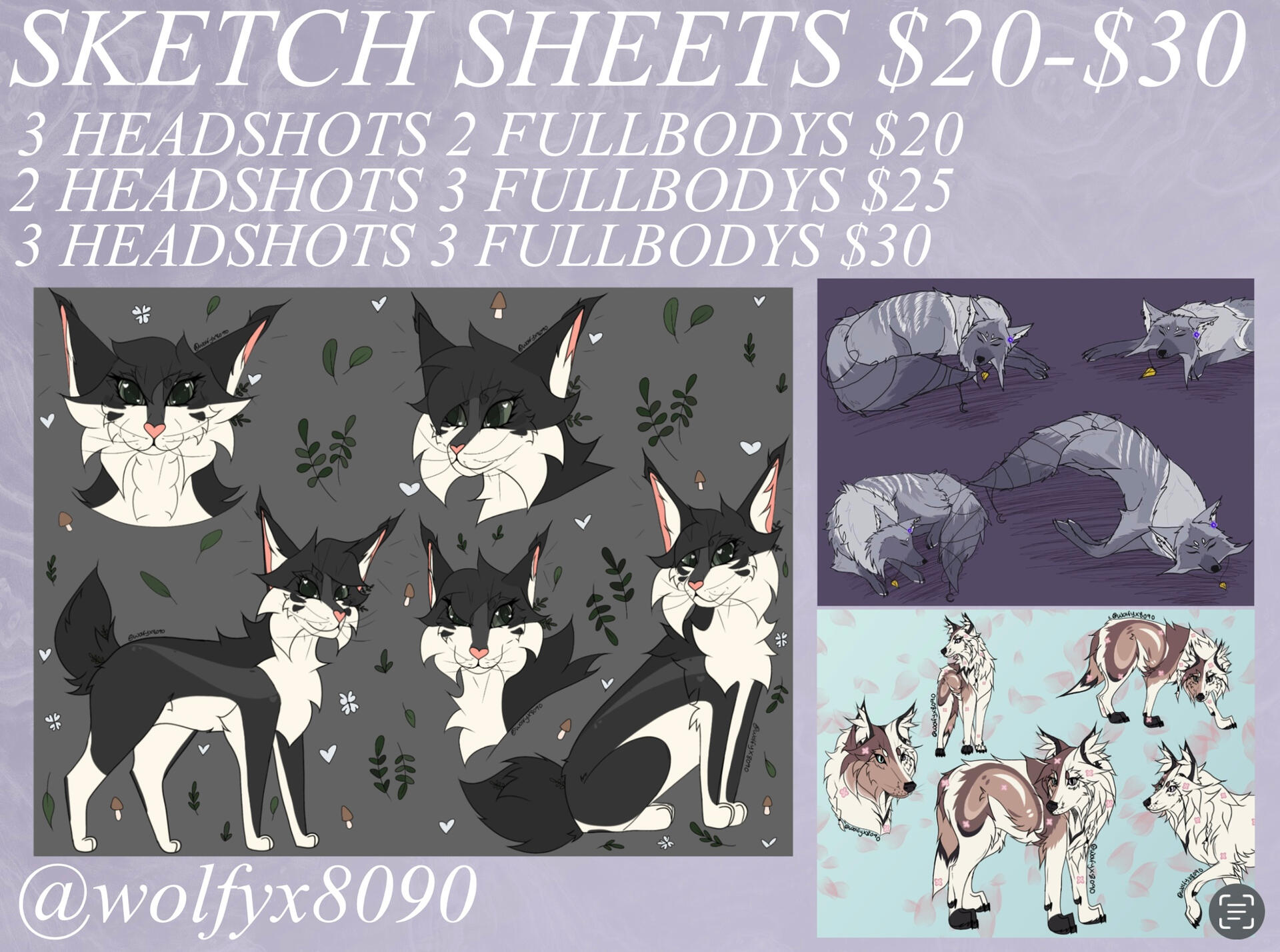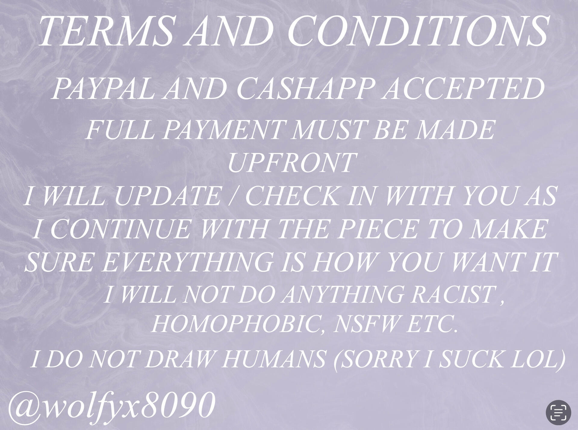 Hey y’all! Here’s all my art social media and my commission info! Thanks so much for the intrest!🖤 if you have any questions plz DM my Insta, where I’m most active! ( if any of the sites don’t work, my username is @wolfyx8090 for all my art social media! 😁